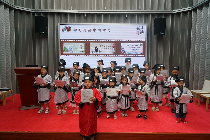活动还设置有“爸爸妈妈我想对你说”的亲子互动环节,亲子间互吐心声,共同定格成长瞬间。最后,孩子们统一穿上汉服,齐声朗诵学习的《论语》章句,抑扬顿挫的声调和韵味,赢得全场如潮的掌声,为此次亲子活动画上了圆满句号。