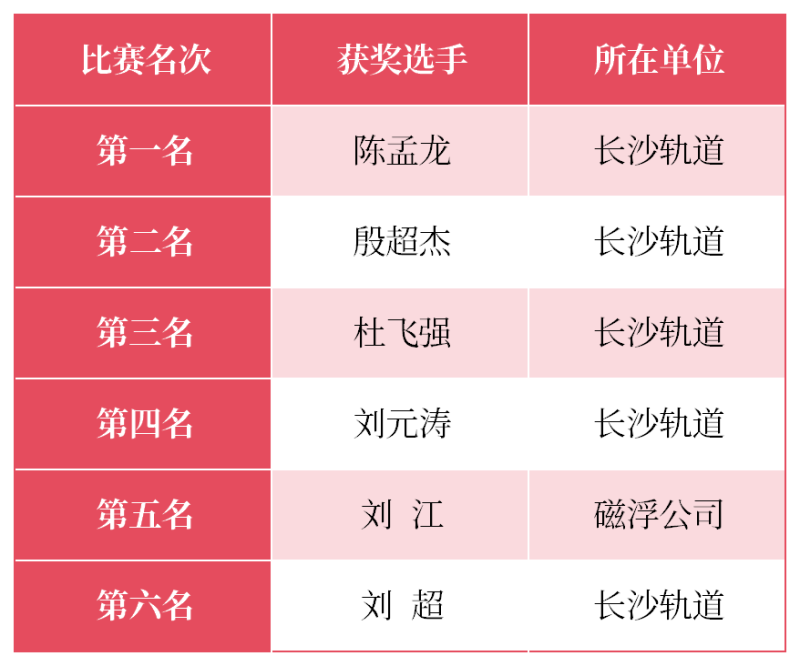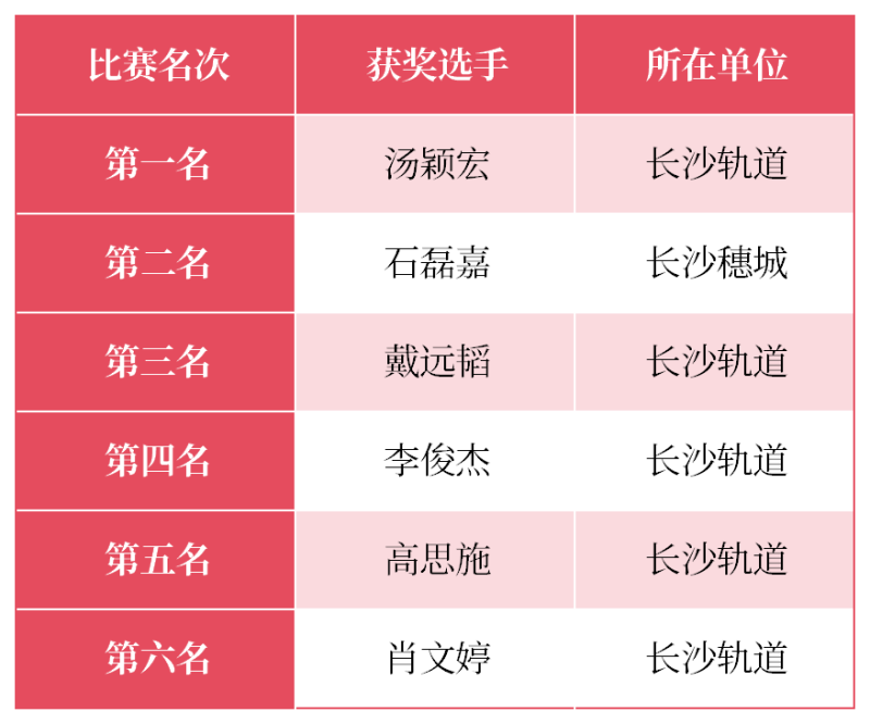 此次大赛共设置城市轨道交通服务员、城市轨道行车调度员两个项目。经过2天激烈角逐,50名从初赛中脱颖而出的选手,同场学习交流,相互切磋技艺。最终,长沙轨道汤颖宏、陈孟龙分获城市轨道交通服务员项目、城市轨道交通行车调度员项目第一名,将被授予“长沙市技术能手”和“长沙市青年岗位能手”称号,同时将按程序申报“长沙市五一劳动奖章”荣誉称号。其中,城市轨道交通行车调度员的优胜选手将代表湖南省参加在济南举办的2023年全国行业职业技能竞赛——第十四届全国交通运输行业职业技能大赛。