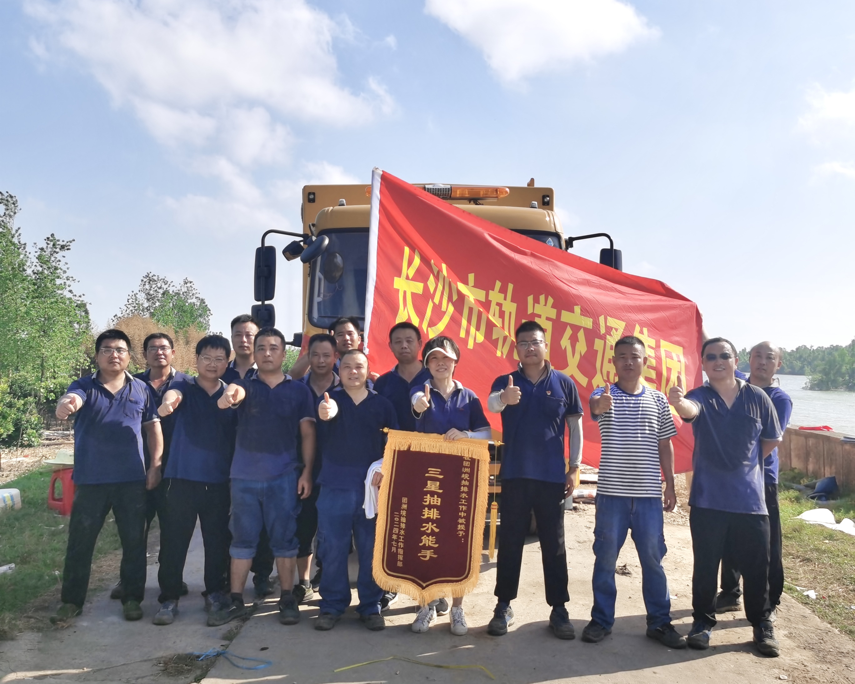 7月26日,驰援岳阳华容的14名轨道精英们顺利完成团洲垸排涝抢险任务,平安凯旋。自7月10日抵达团洲垸后,长沙轨道排涝抢险队便采取“人轮换、泵不停”的方式,利用4台排水泵24小时不停歇开展排涝作业。经17个昼夜连续奋战,截至7月26日6时30分,全员已连续战斗358小时,抽排水约53.96万立方米。队员返程前,团洲垸抽排水工作指挥部相关负责人来到堤坝现场,肯定了长沙轨道排涝抢险队在抽排水一线高效作业、奋勇争先的优异表现,为队员们现场颁发“三星抽排水能手”锦旗。