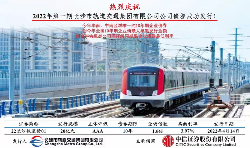4月14日,该笔优质企业债券成功发行,票面利率仅为3.97%,是今年华南、中南区域唯一纯10年期企业债券创今年全国10年期企业最大单笔发行金额,创今年轨道类公司同评级同期限企业债券最低利率。本期债券的成功发行保障了轨道交通项目的顺利推进。
